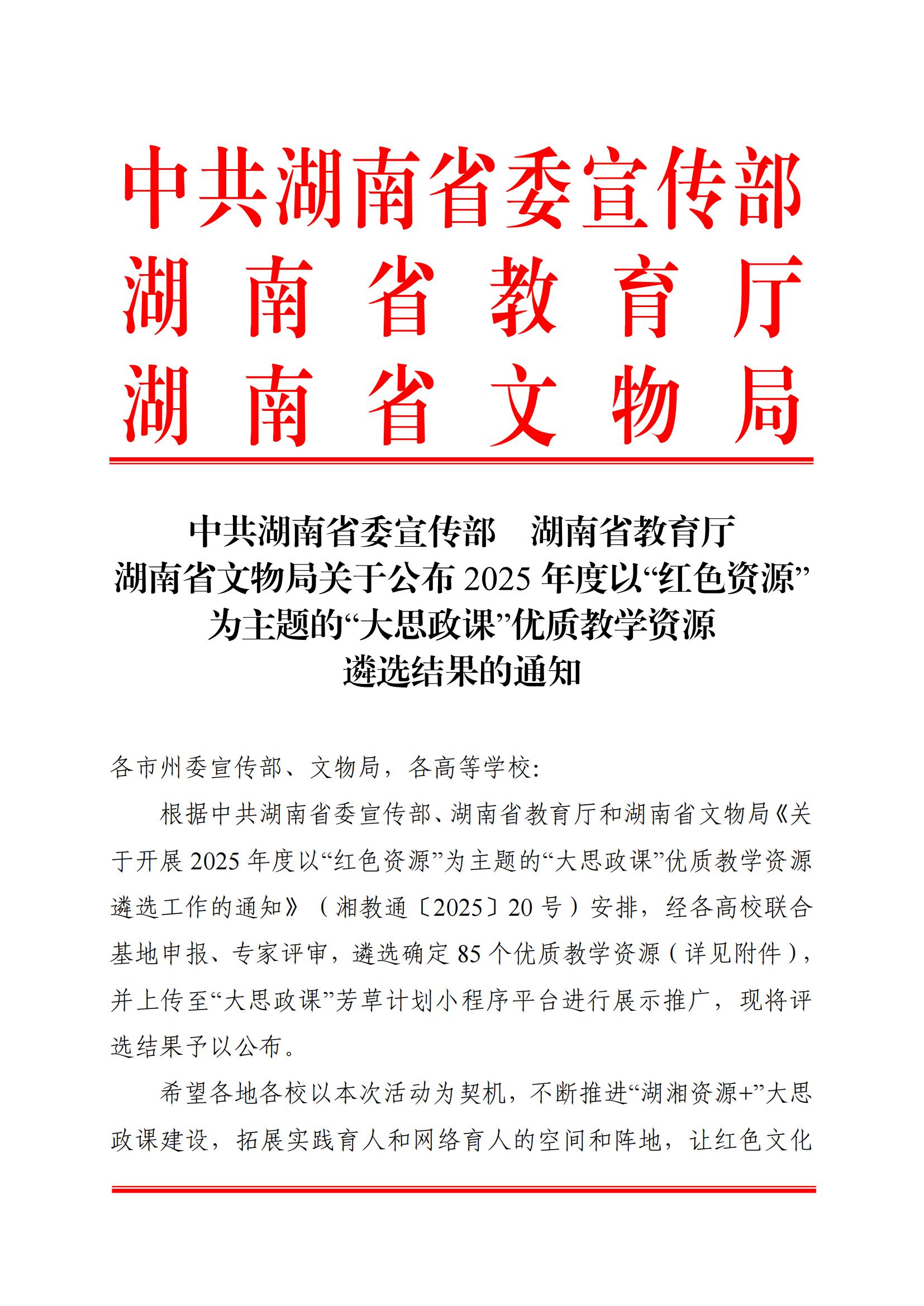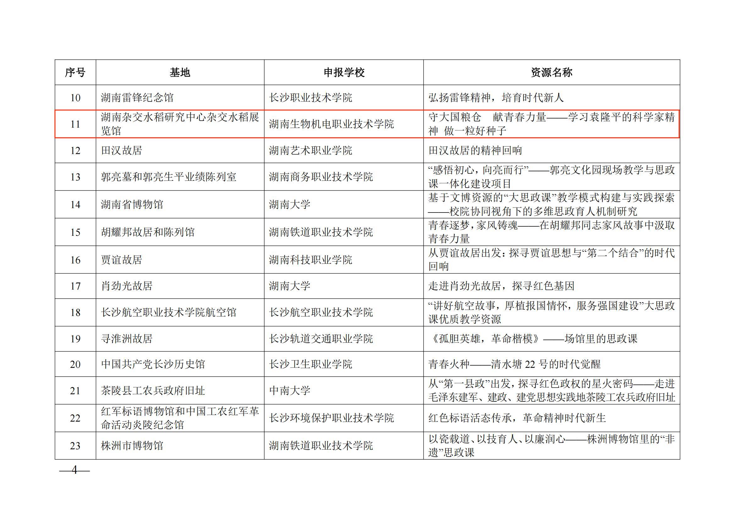 近日,中共湖南省委宣传部、湖南省教育厅、湖南省文物局联合发布了《关于公布 2025 年度以“红色资源”为主题的“大思政课”优质教学资源遴选结果的通知》,湖南生物机电职业技术学院与湖南杂交水稻研究中心杂交水稻展览馆共同申报的《守大国粮仓 献青春力量——学习袁隆平的科学家精神 做一粒好种子》“大思政课”教学资源成功入选。